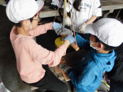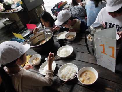 火おこしで作った火で、最後の野外炊事をしました。1回目の反省を踏まえて,水の量を少なめにして調理しました。どの班もおいしく出来上がりました。