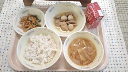 鶏肉のさっぱり煮はお酢を使った、この時期にピッタリな献立です。一緒に給食を食べた1年1組でもさっぱり煮は大好評で、汁までごはんと一緒に食べている子もいました。