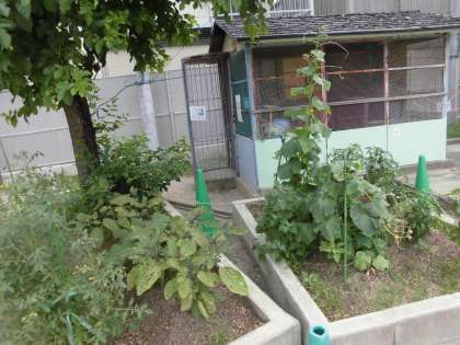 今年度、飼育小屋前の花壇を改良し、花壇を復活させました。「学校を花や植物で明るくする」というめあてで活動していますが、子どもたちのがんばりで、立派な夏野菜ができました。