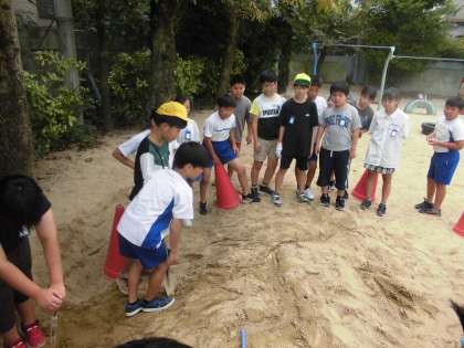 『流れる水には、どんなはららきがあるのだろうか』という学習問題で進めています。実際に水を流して様子を観察すればよいということで、さっそく砂場に山を作って水を流しました。たくさんの気づきがあり、交流することができました。