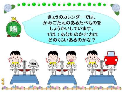 今日の給食クイズ「いただきます」では,かむ力の強さは自分の体重と同じくらいの強さであることを伝えました。自分に備わっているかむ力が保てるよう,噛みごたえのある食べ物を積極的にとりましょう。