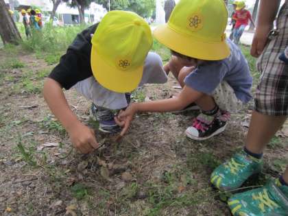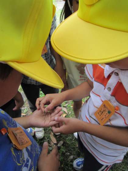小さなバッタをつかまえたり,イチョウやもみじが青く生い茂っていたり,たくさん発見があったようです。また,公園までの通り道にはぶどうやトマトがなっているのを見つけている子もいました。田んぼにはおたまじゃくしやあめんぼがたくさん泳いでいました。