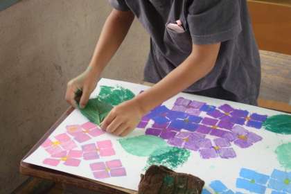そのかたつむりが住みやすいあじさいを描いています。