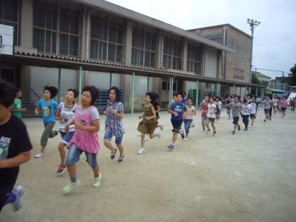 集団登校後,運動場へ出て準備をします。8時20分スタート。