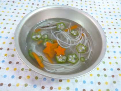 今日の給食では,そうめんを天の川にみたて,オクラと人参でお星さまの形★を作りました。星型のラッキーにんじんを食べた子ども達には,きっと良いことがあるでしょう。