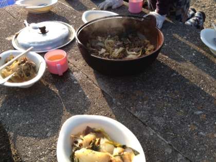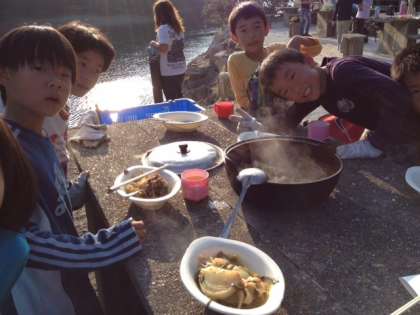 野外で食べるので,さらにおいしい!ましてや,友だちと苦労して作ったすき焼き風煮ですから,おいしさ百倍!!