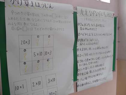 中校舎の1階から2階へかけての踊り場の掲示板に,3年の算数コーナーがあります。