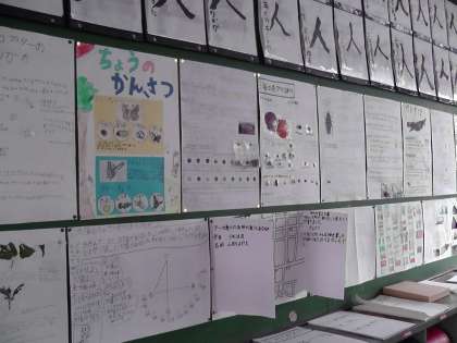 子ども達が夏休みに頑張った自由研究を各クラスの掲示板に掲示しています。