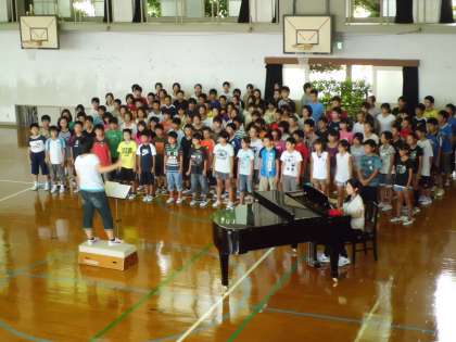 先週の体育館練習の時に,授業が終わって運動場で遊んでいた低学年の子どもたちが,体育館を覗いていました。どうしたのか尋ねてみると,「歌が上手。」と教えてくれました。低学年の子どもたちの声を6年生に伝えると,とてもうれしそうにしていました。そのはずです。自分たちの歌声が認められたのですから。