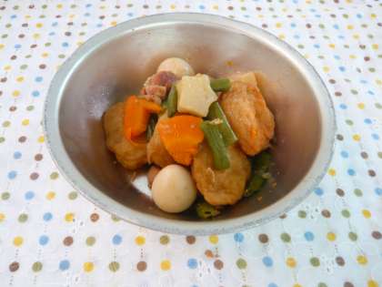 今日は,いつもの「ひらてんとこんにゃくの煮つけ」にひと工夫をし,こんにゃくを★型にしました。