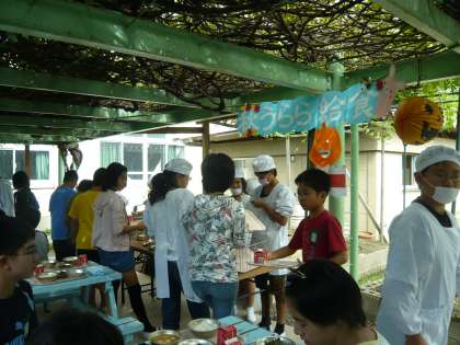 今日の秋うらら給食は,藤の木の陰で涼しさが感じられ,6年生は楽しく会話をしながら食事をしていました。