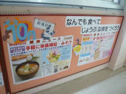 「なんでも食べてじょうぶな体をつくろう」が今月の目標です。目標にあわせて,毎月の給食掲示板を張り替えています。子ども達は,ふと立ち止まりながらクイズに挑戦したり,給食室からのハガキの返事を読んだりしています。
