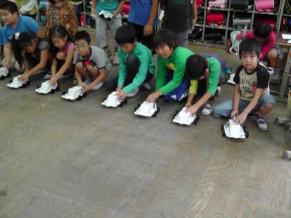 子ども達は,実験を通して,ゴムを引っ張る力を強くした方が,ゴムがのびた後に,戻ろうとする力も強くなるから,たくさん走るのではないか,ということに気づいていました。