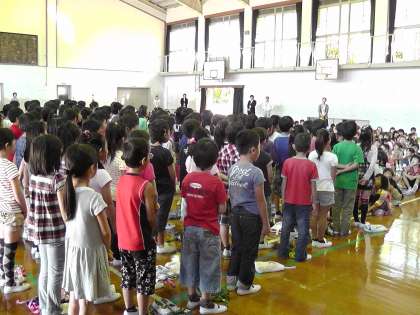 9名の児童が主な言葉を発言し,最後に学年全員で,「どうぞ,聞いて下さい。」と全校に向けて発言しました。