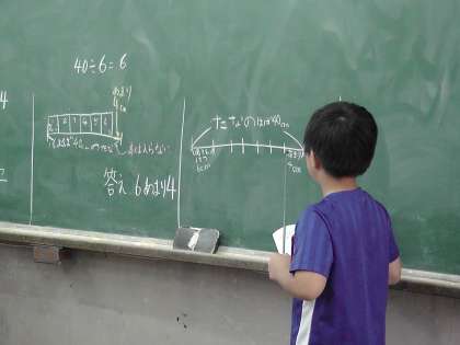 このような問題では,あまりをどのように扱うのか考えを出すのが,難しいようで,子ども達はたくさん頭を悩ませています。