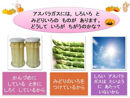 アスパラガスの旬は,春ですが,給食では冷凍したものを使用しています。ご家庭でも,下茹でをしてから,冷水にさらし,水気をふき取って冷凍すれば保存することができます。グリーンやホワイト,パープルなどの色がありますので,料理の彩りにおすすめです。