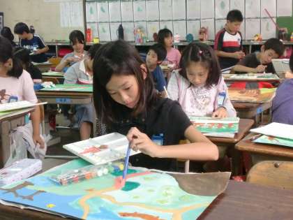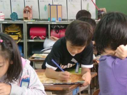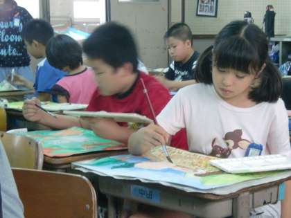 「お話の絵」が完成に近づいています。コンテで下絵をかいてから,ていねいにていねいに彩色してきました。みんな真剣な顔で「ここは何色にしようか。」「はみ出ないように塗らないと。」と取り組んでいます。どの子もそれぞれの良さが出て,友達の作品を鑑賞するのが楽しみです。