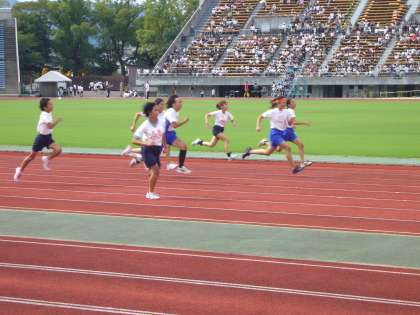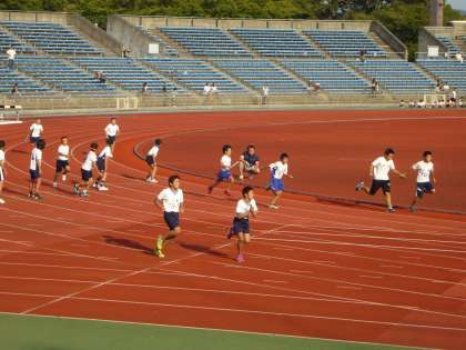 競技場を走り終わってスタンドに戻ってくる子どもたち。