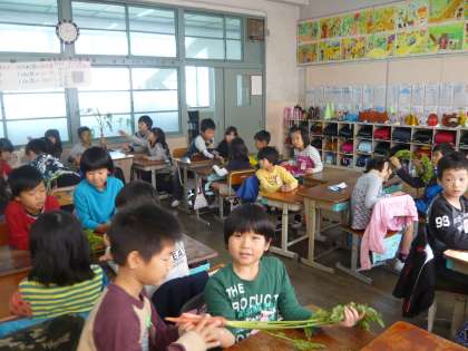 子ども達は,葉っぱのついているにんじんに驚き,一口食べると「さつまいもみたいに甘くておいしい」「なすとは,ちがうにおいがするぞ」などいろいろ観察できていました。