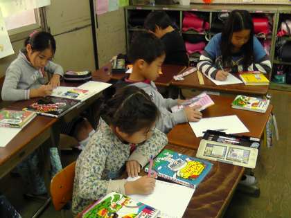 文を書いた後には,絵を描きます。絵も本の挿絵を見て,上手に描いて色を塗っています。