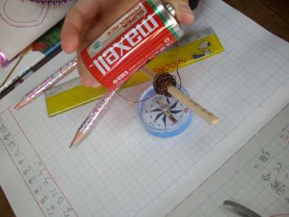 試行錯誤させました。「うすくまくと力が分散するので弱くなる。」「固めて何重もまいた方が力が集中するので強い。」「導線のすきまはない方がいい。」など様々な考えを出し、割り箸に導線を巻いていました。「本当だ。狭く何重もまけば強くなる」と
