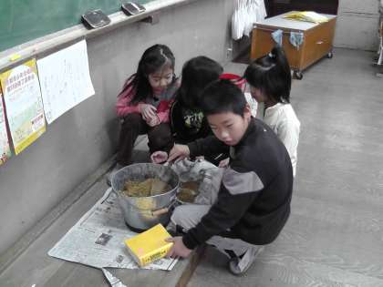 運動場の砂を教室に持ってきて,砂で1kgの重さを作ってみる活動をしました。