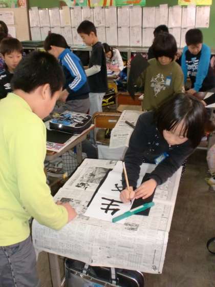 書写では,気持ちを新たに書初めに取り組んでいます。4年生は「生きる力」を書きました。机を縦向けにして2人組で真剣に書いています。「ここは太くしたほうがいいよ。」「こっちの方がよく書けていると思うよ。」と声を掛け合っていました。