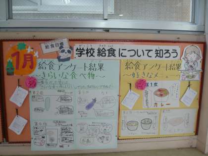1日目は,全校の子ども達に行なった給食アンケート〜好きなメニュー ・ 嫌いな食べ物〜のランキングを発表しました。好きな食べ物の第一位は「カレー」,第二位は「シチュー」「プリプリ中華いため」,第三位は「ヒレカツ」でした。やはり,「カレー」は給食の人気者のようです。