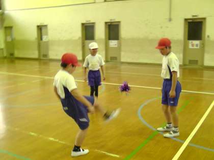 ボールの様な形をしていないため,続けて蹴る事が難しいようでしたが,子ども達は親しみをもって遊んでいました。