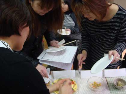 30分間に6品を作るはやわざで,さらに赤・黄・緑の3色入ったバランスのよいものを披露しました。リハーサルを重ねていても本番何が起こるかわかりません。そのハプニングにもめげず,息の合った2人のコラボはすばらしいものでした。