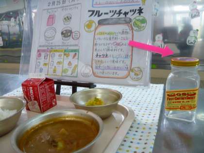 子ども達はビンのにおいをかいで,「うわ〜こんな香りはじめて!」と驚いたり,パッケージを見て「チャツネ?チョツネ?むずかしい名前だな。」と言いながら,大好きなカレーをもりもり食べていました。