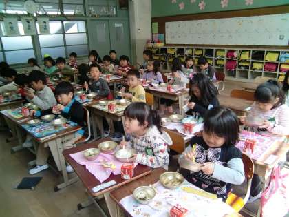 1年2組の給食風景。カリカリとした黒大豆を一粒ひとつぶあじわいながらたべていました。「コーヒーみないなあじ・・・」「ごはんと食べるとおいしい」苦手な児童も奥歯をつかってよくかみながらあじをみつけていました。