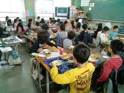 2年1組の給食風景。食缶をピカピカに配り終え,もりもりと給食を食べていました。