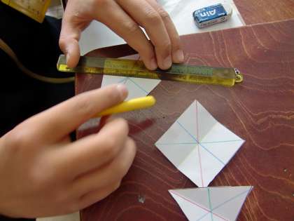算数では「対称な図形」の学習をしています。今日の学習は,正多角形の対称の軸は何本あるかを調べる学習です。子ども達は正多角形をはさみで丁寧に切り,実際に折って対称の軸を探していきました。