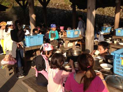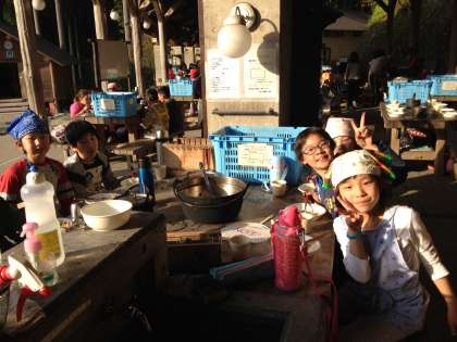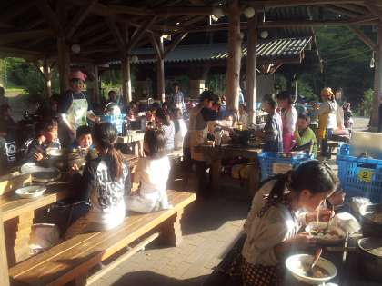 おいしいすき焼き風煮が,完成しました。もりもり食べている写真が届きました。夕日に照らされ,野外炊事を満喫しているようです。