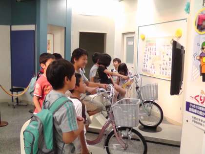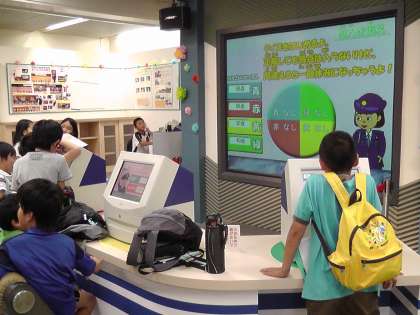 1階にはクイズなど楽しむ事のできる展示物があります。子ども達は簡単なゲームをしながら,警察の仕事や危険な事から身を守る方法など楽しく学んでいました。