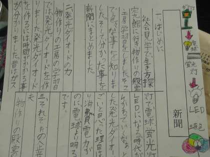 学習で学んだ事を新聞にしてまとめています。総合でも社会の学習でも新聞形式でまとめる機会が増えてきています。その都度,子ども達は自分の言葉でまとめる力をつけてきています。