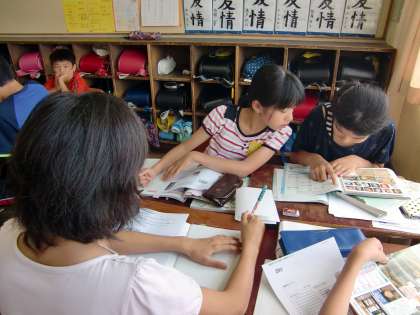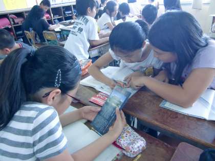国語科の学習では,自分達の町を紹介するパンフレット作りを行っています。まずは教科書を読んで,これからどのようなパンフレットを作っていくのかを知り,何を取り上げるかを考えました。次に,相手意識をもってパンフレット作りを行えるように,誰に見てもらいたいかを話し合うと,「京都出身ではない先生に見てもらいたい。」「クラスの友だちに見てもらいたい。」という意見が出てきました。クラスの友だちに見てもらうためには,どのような言葉や表現を使ったらよいかも考えながら情報を集めています。