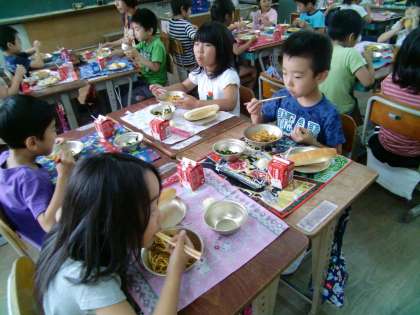 食の学習は,1年3組。「あじみつけ」では,あまい・すっぱい・しおからい・にがいといった基本的な味覚について,よくかむことで食べ物の中にかくれている味をたくさんみつけてみようという学習をしました。給食時間,「ひと口30回,50回,99回かんだよ。」という声と共に,「パンの甘い味がみつかった」とか「チーズはしおからい味がした」とたくさんの味を発見していました。たくさんの味をみつけながら,今日は,パンも牛乳もおかずもすべて完食,ペロリ賞でした。