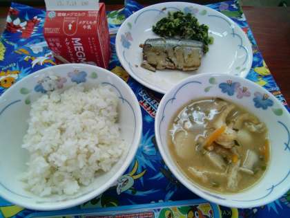 今日の給食は,麦ごはん・牛乳・さんまのしょうが煮・大根葉のごま炒め・いものこ汁でした。