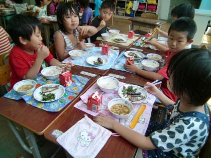 食の学習は1年2組。「あじみつけ」の学習では,今日の給食でみつけた味をたくさん発表し,感じたおいしさをクラスで共有しあいました。感じた味を言葉に表すことでおいしさを具体的にみつけることができていました。