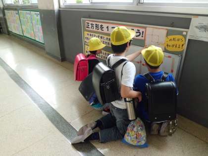 「算数コーナー」での子ども達の様子です。「算数コーナー」とは,本校が独自で取り組んでいることで,各学年に「算数コーナー」が設けられています。