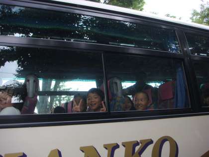2泊3日の大きな荷物とともにバスに乗り込みました。保護者の方々に手を振ってしばらくお別れです。でも,3日後の子どもたちは,心を大きくして帰ってきますよ。