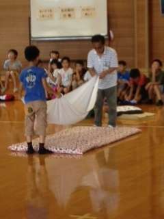一人一枚ずつ配っていただいて,寝具の準備をもちろん自分でします。ちょっとむずかしいときには,友だちといっしょにします。