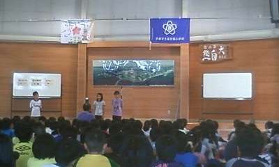 2日目の朝のいちばんの活動は,「朝のつどい」です。この活動は,みさきの家でいっしょになる学校と合同で行うものです。互いの学校を紹介しあい,また校歌を聴き合います。このときの係の子どもたちは,「西京極小学校をどのように紹介すればいいのかな。」と相談して考え合います。