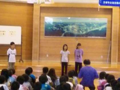 「朝のつどい」では,他の学校と合同ですから,迷惑をかけることがないようにと指導します。まず,約束の時刻に遅れないこと,他の学校の学校紹介,校歌をしっかりと聞くこと,そして,わたしたちに西京極小学校の代表としてしっかり学校のことを伝えること,校歌を歌うことを大事にします。