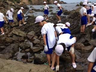 西京極小学校は,磯観察をして楽しむだけでなく,毎年「クリーン大作戦?」といって浜をきれいに掃除をします。浜にあるごみをきちんと持ち帰り所員の方々に処分していただきます。今年の西京極の子どもたちも掃除をしましたよ。
