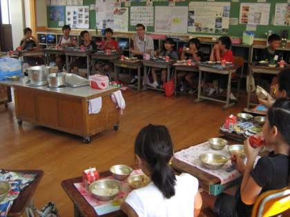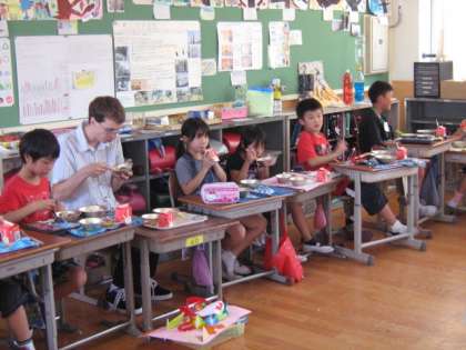 新しくALTの先生として来られた,コリー先生とランチタイムに一緒に給食を食べました。楽しみにしていた子ども達は,机を円にして先生を迎えました。コリー先生のカナダの国旗のネクタイを発見しお話したり,日本に来てからの生活を質問したりとたくさんお話ができました。