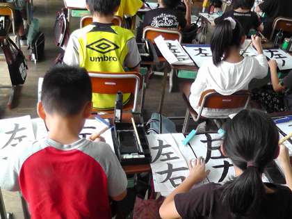 今週の書写は,以前練習した『左右』という文字の清書です。前回,書いたものを見て,どこを良くすれば良いのか考えて書いています。文字のバランスを意識して,みんな書いていました。