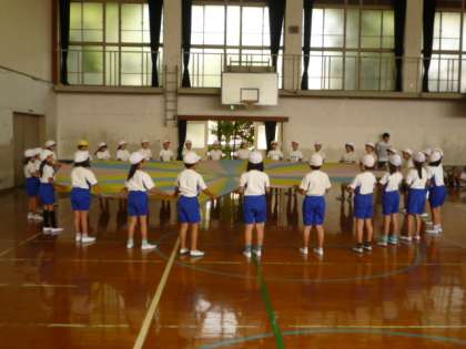 ひまわり学級のお友だちとの『JOY!!バルーン』・・・曲に合わせてバルーンを上に下に,右に左に動かしたり,大きく膨らませたりします。とても楽しく練習しています。